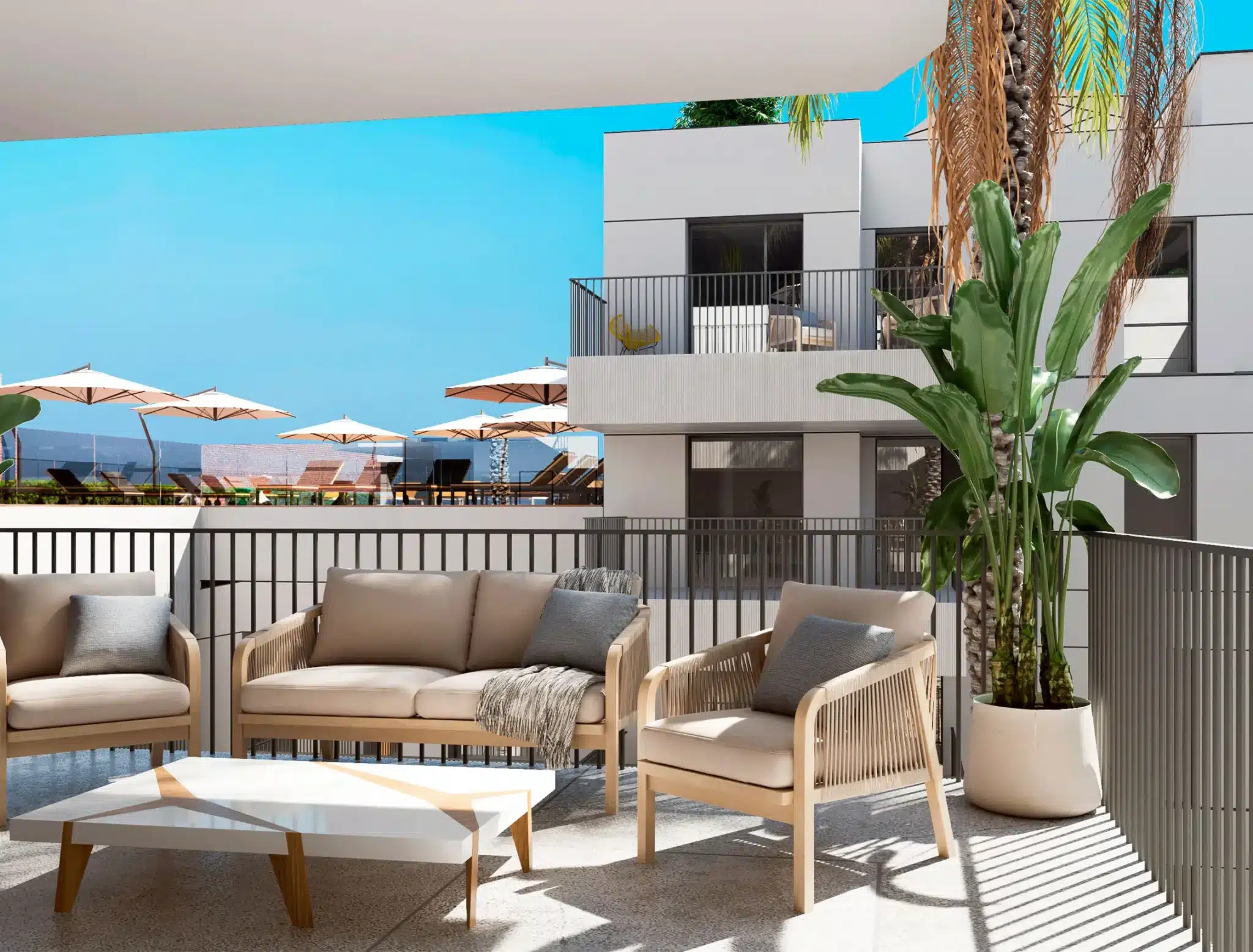 El residencial cuenta con viviendas de 1, 2 y 3 dormitorios, todas con terraza, pensadas para aprovechar al máximo la luz natural y crear espacios amplios y funcionales. Las plantas bajas disponen de patios privados y los áticos ofrecen exclusivos soláriums.